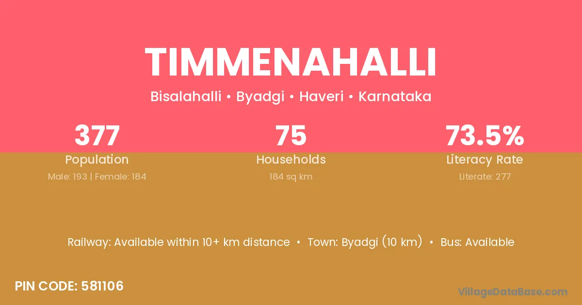 Timmenahalli village has a total population of 377 people, of which 193 are males and 184 are females.