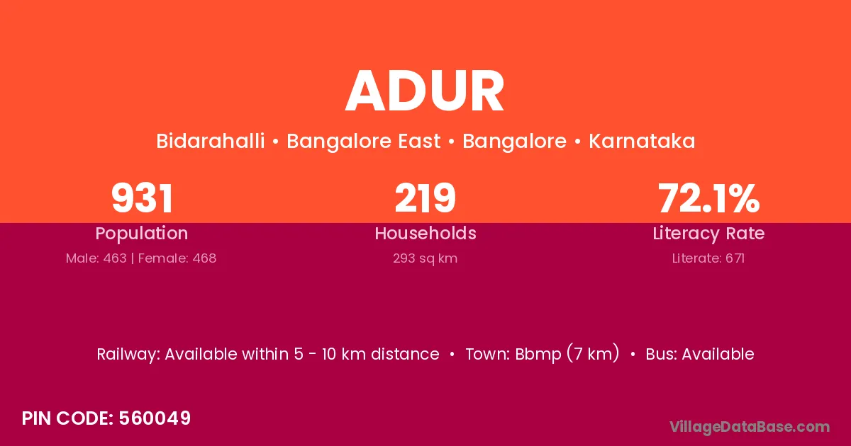 Hangal (19 km) is the nearest town to Adur village for major economic activities and is located approximately 19 km away.