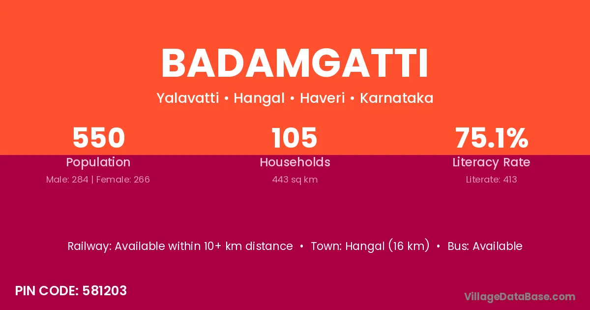 Hangal (16 km) is the nearest town to Badamgatti village for major economic activities and is located approximately 16 km away.