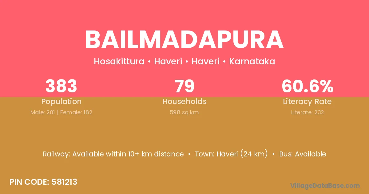 Haveri (24 km) is the nearest town to Bailmadapura village for major economic activities and is located approximately 24 km away.