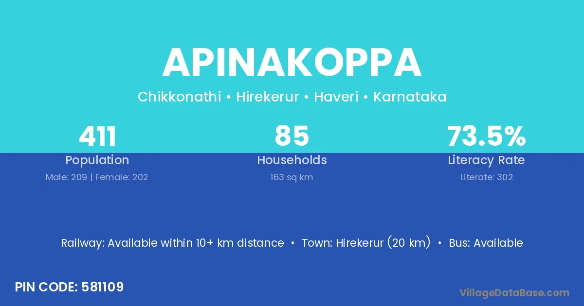 Hirekerur (20 km) is the nearest town to Apinakoppa village for major economic activities and is located approximately 20 km away.