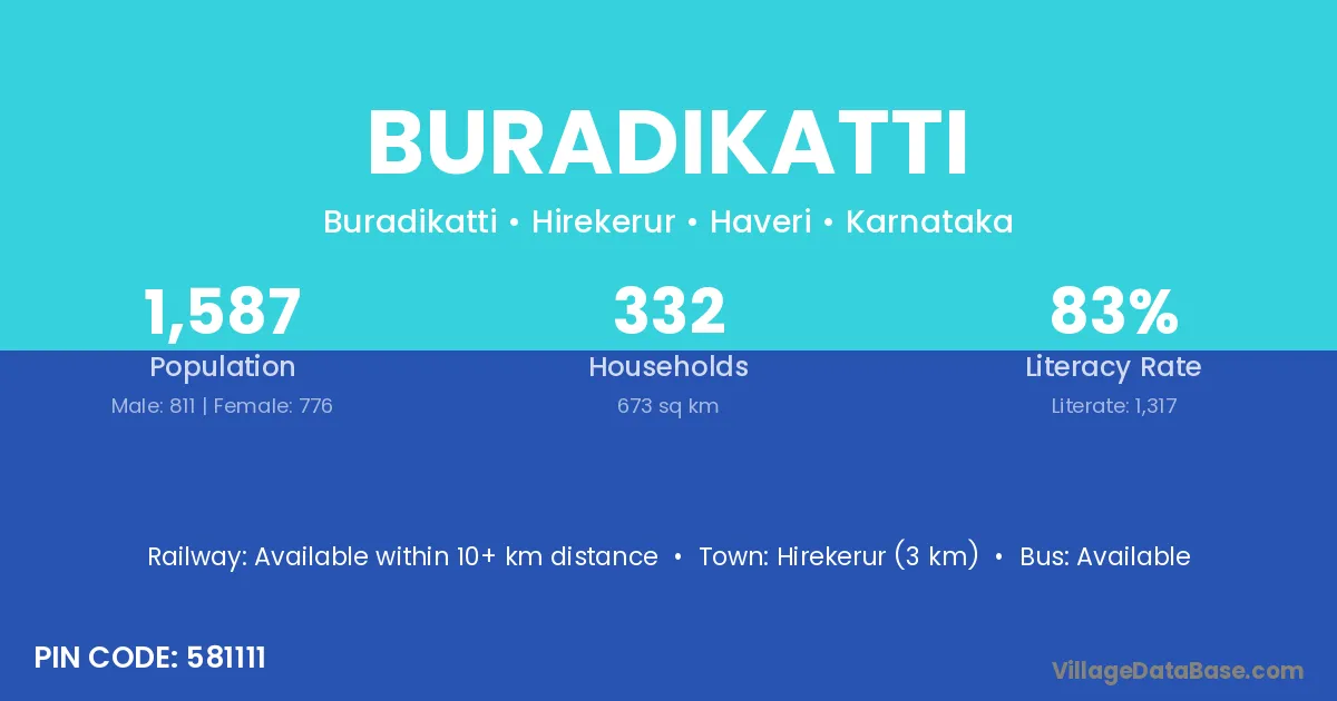 Hirekerur (3 km) is the nearest town to Buradikatti village for major economic activities and is located approximately 3 km away.