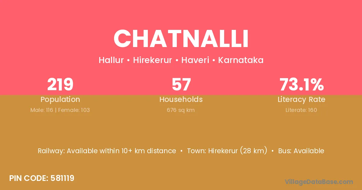 Hirekerur (28 km) is the nearest town to Chatnalli village for major economic activities and is located approximately 28 km away.