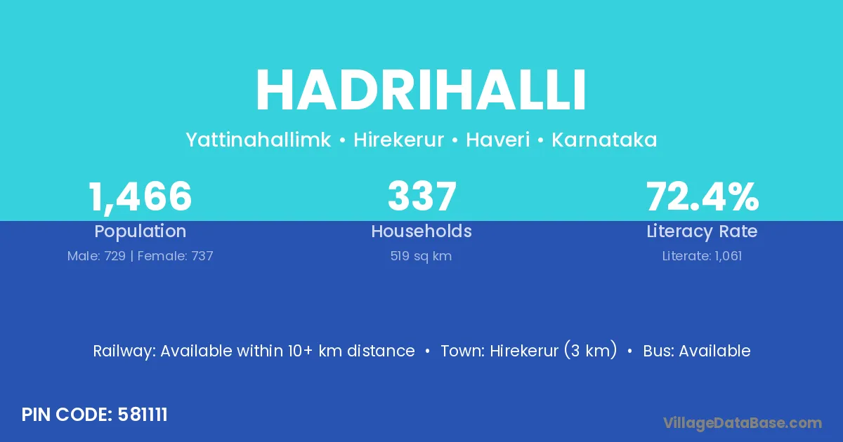 Hirekerur (3 km) is the nearest town to Hadrihalli village for major economic activities and is located approximately 3 km away.