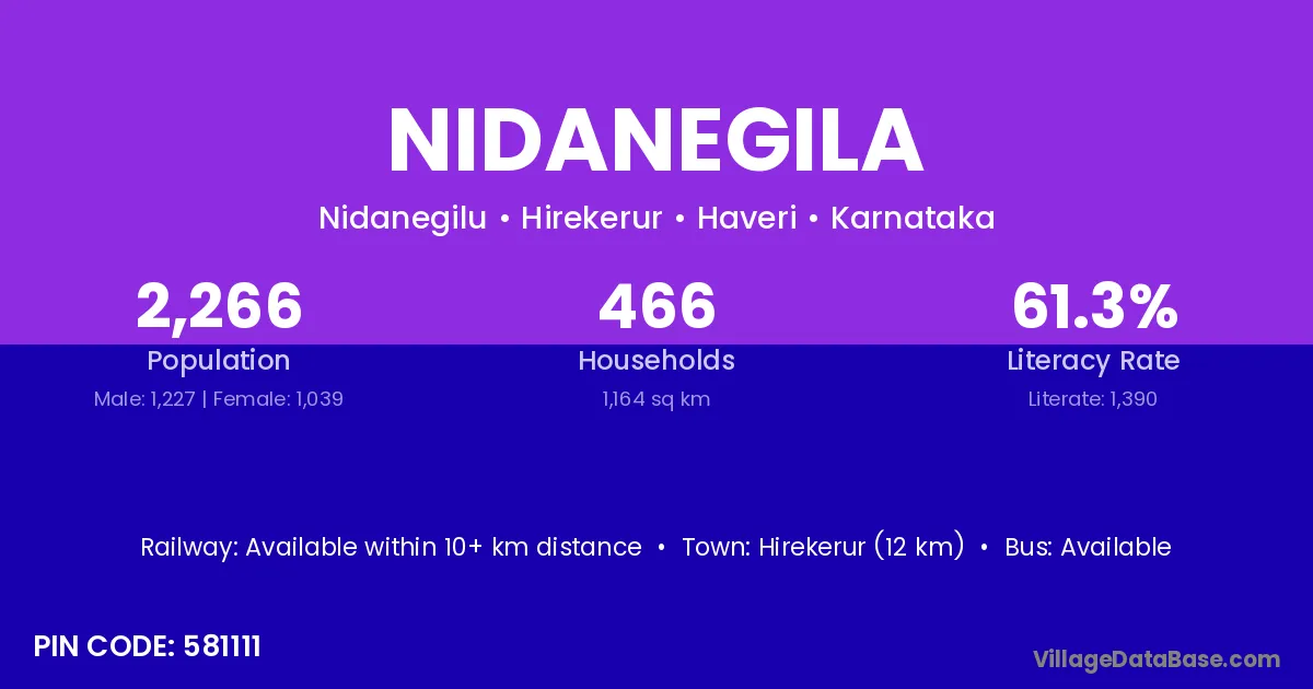 Hirekerur (12 km) is the nearest town to Nidanegila village for major economic activities and is located approximately 12 km away.