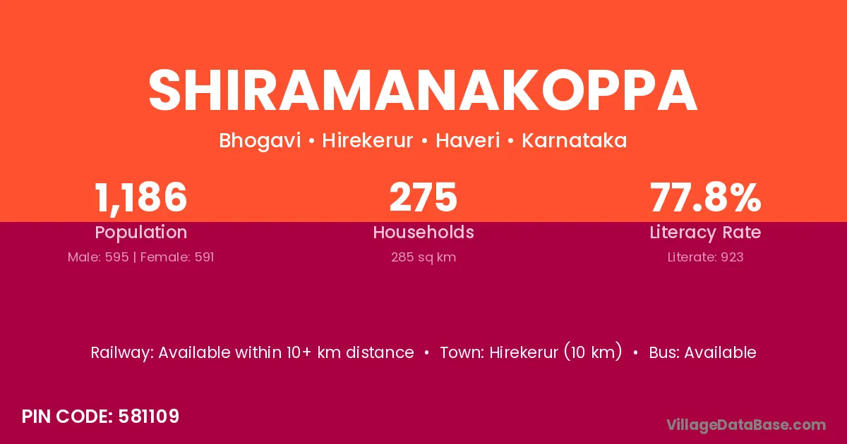 Shiramanakoppa village has a total population of 1,186 people, of which 595 are males and 591 are females.