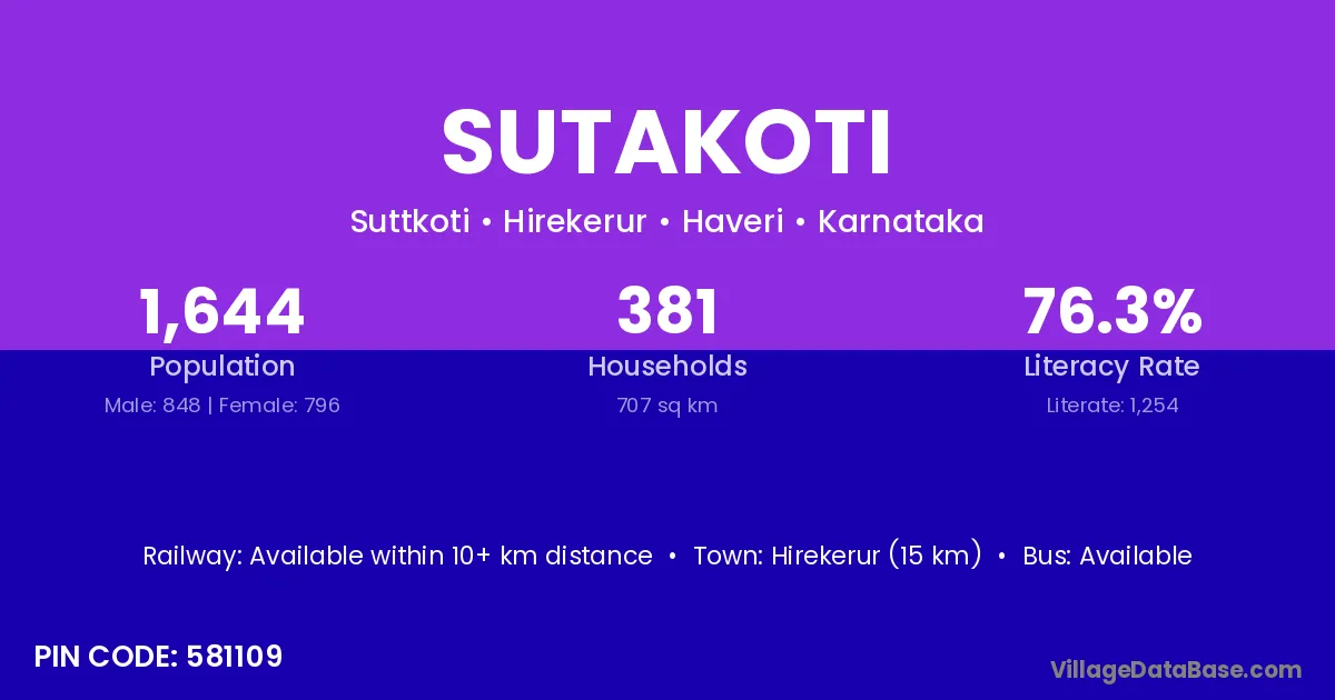 Hirekerur (15 km) is the nearest town to Sutakoti village for major economic activities and is located approximately 15 km away.