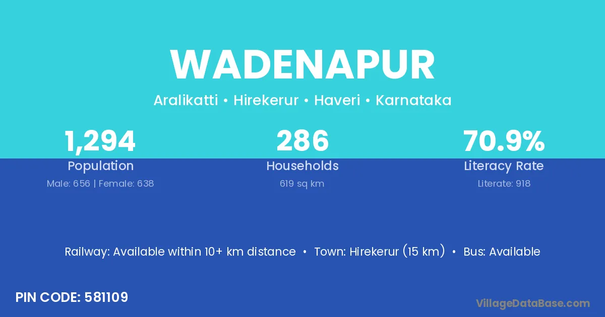 Hirekerur (15 km) is the nearest town to Wadenapur village for major economic activities and is located approximately 15 km away.