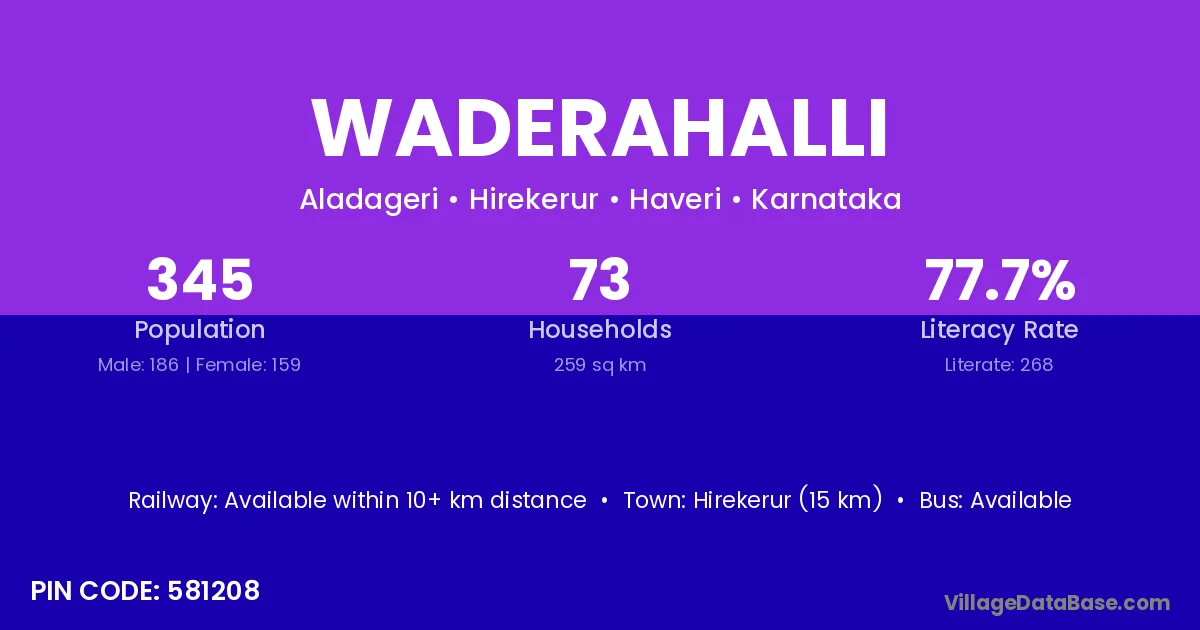 Hirekerur (15 km) is the nearest town to Waderahalli village for major economic activities and is located approximately 15 km away.