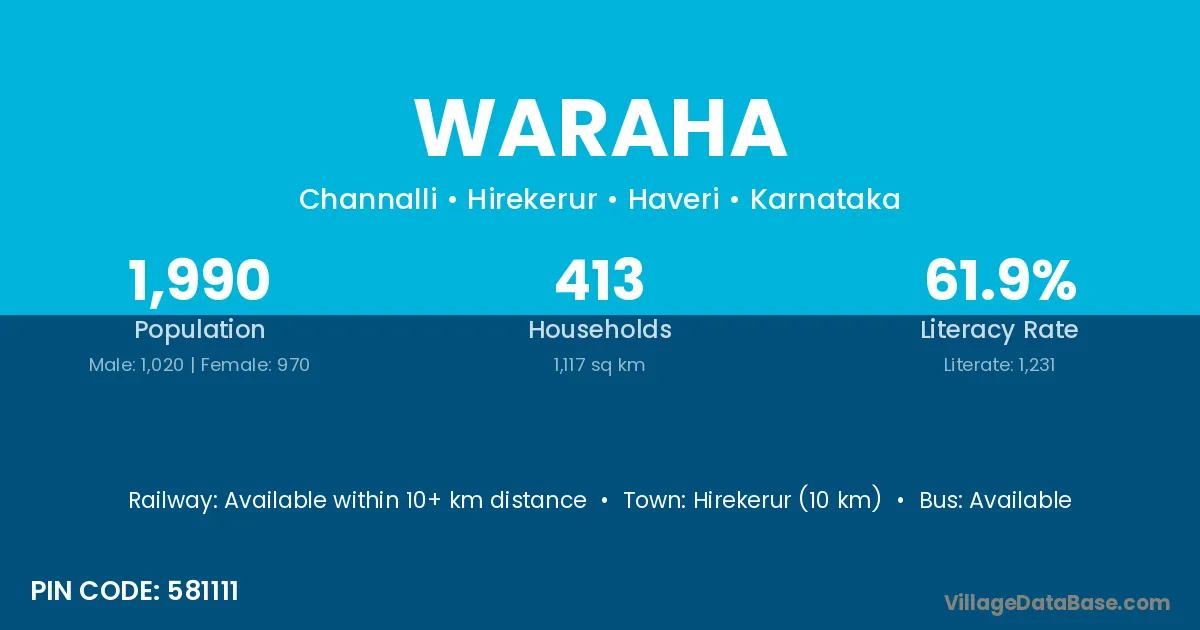 Hirekerur (10 km) is the nearest town to Waraha village for major economic activities and is located approximately 10 km away.