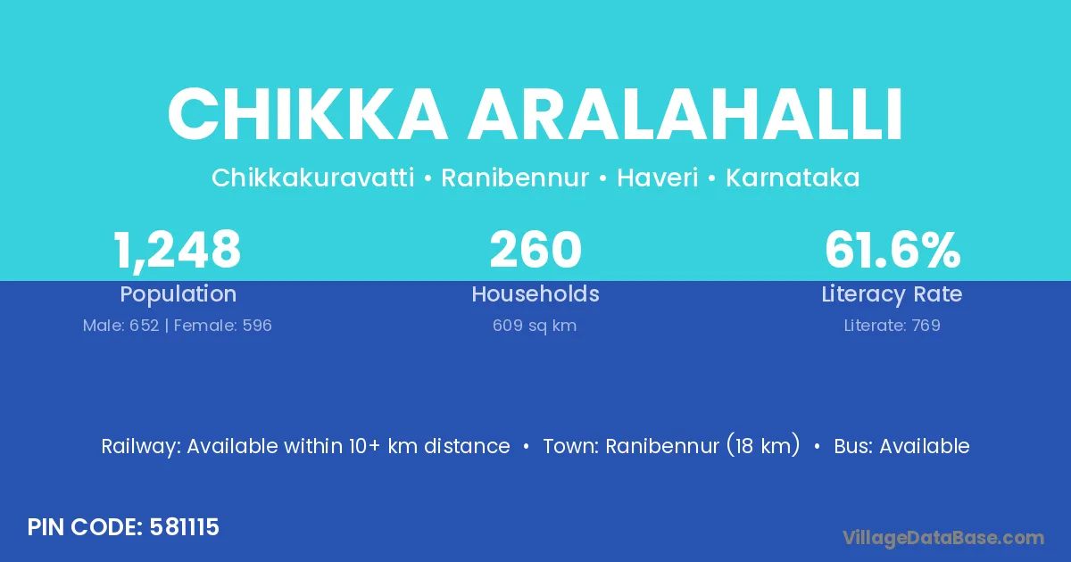 Ranibennur (18 km) is the nearest town to Chikka Aralahalli village for major economic activities and is located approximately 18 km away.