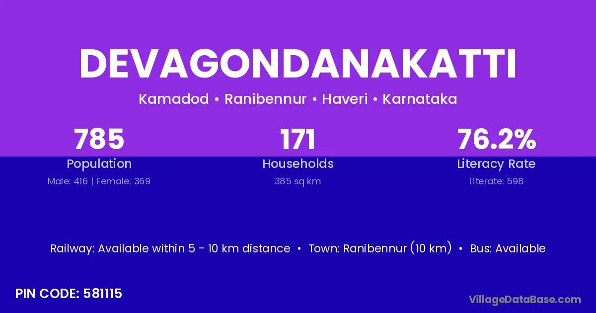 Ranibennur (10 km) is the nearest town to Devagondanakatti village for major economic activities and is located approximately 10 km away.