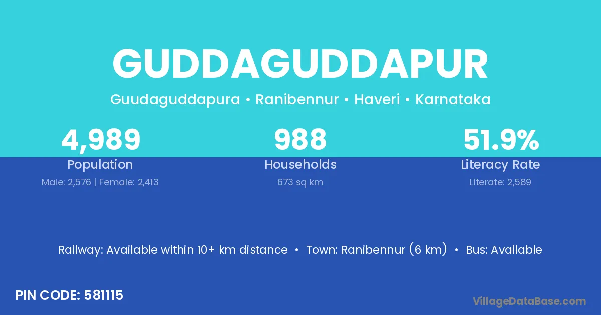 Ranibennur (6 km) is the nearest town to Guddaguddapur village for major economic activities and is located approximately 6 km away.