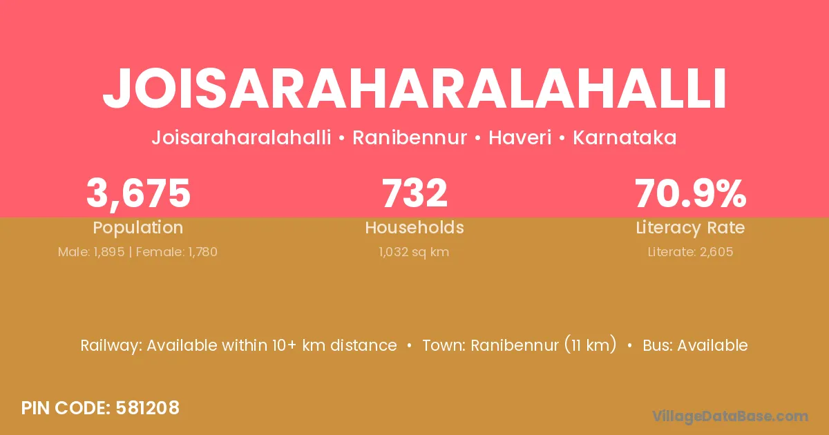 Ranibennur (11 km) is the nearest town to Joisaraharalahalli village for major economic activities and is located approximately 11 km away.