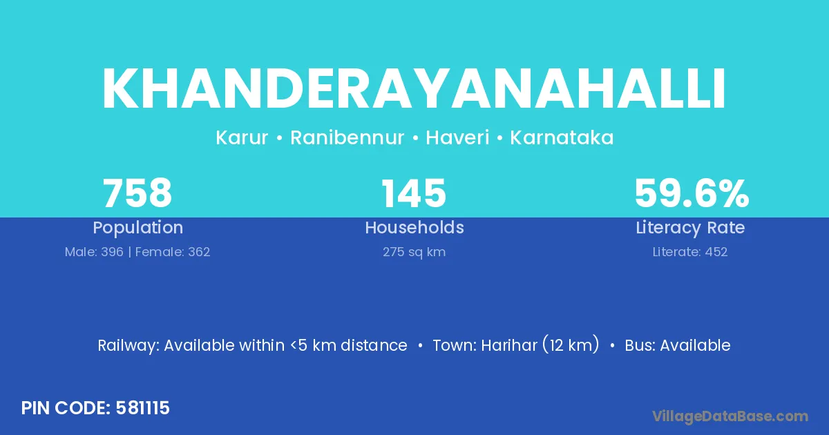 Harihar (12 km) is the nearest town to Khanderayanahalli village for major economic activities and is located approximately 12 km away.