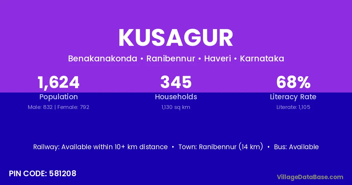 Ranibennur (14 km) is the nearest town to Kusagur village for major economic activities and is located approximately 14 km away.