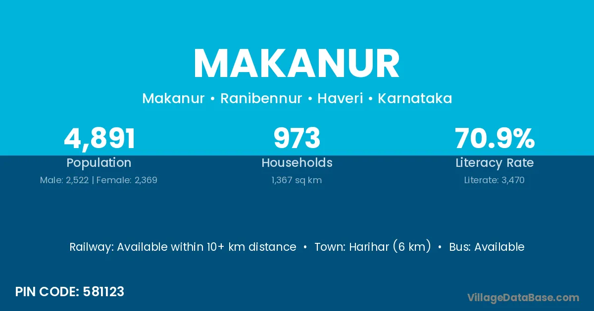 Harihar (6 km) is the nearest town to Makanur village for major economic activities and is located approximately 6 km away.