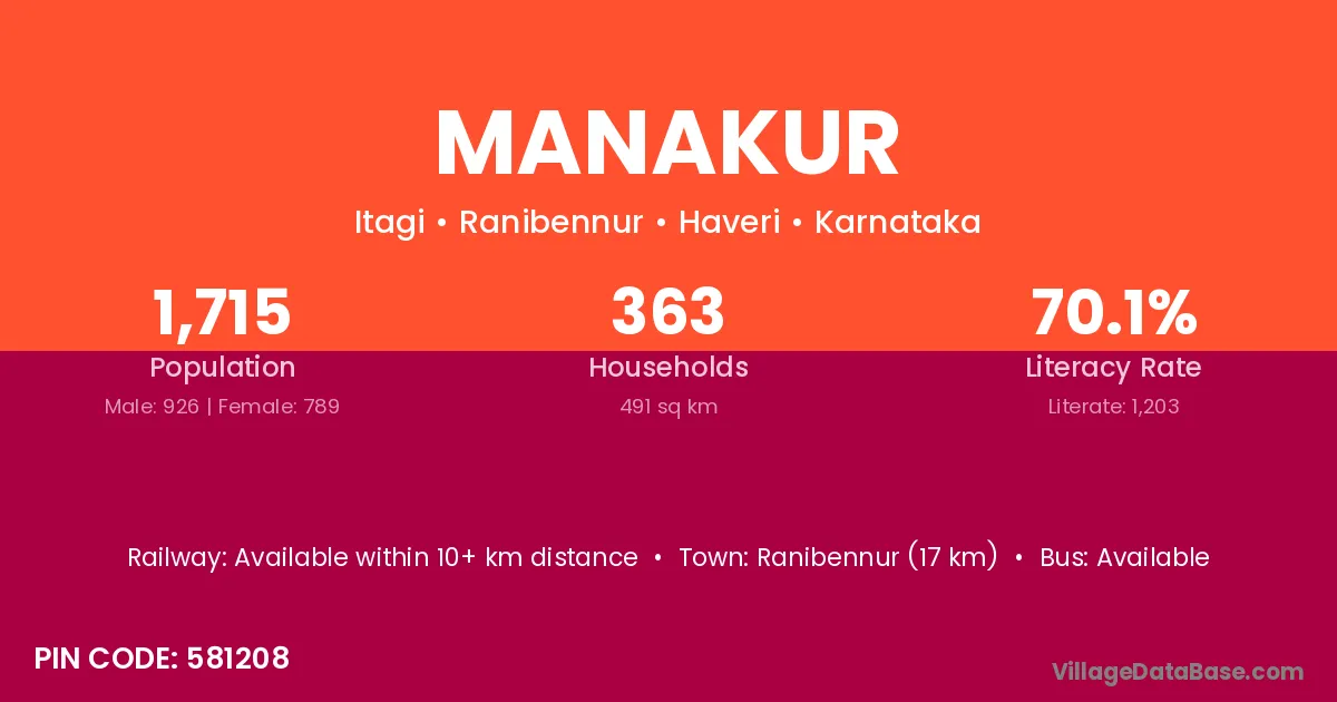 Ranibennur (17 km) is the nearest town to Manakur village for major economic activities and is located approximately 17 km away.