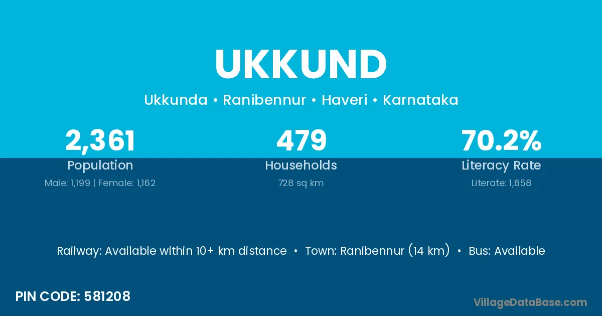 Ranibennur (14 km) is the nearest town to Ukkund village for major economic activities and is located approximately 14 km away.