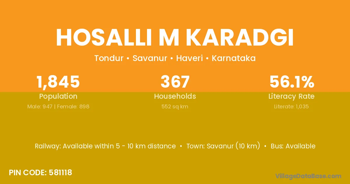 Savanur (10 km) is the nearest town to Hosalli M Karadgi village for major economic activities and is located approximately 10 km away.