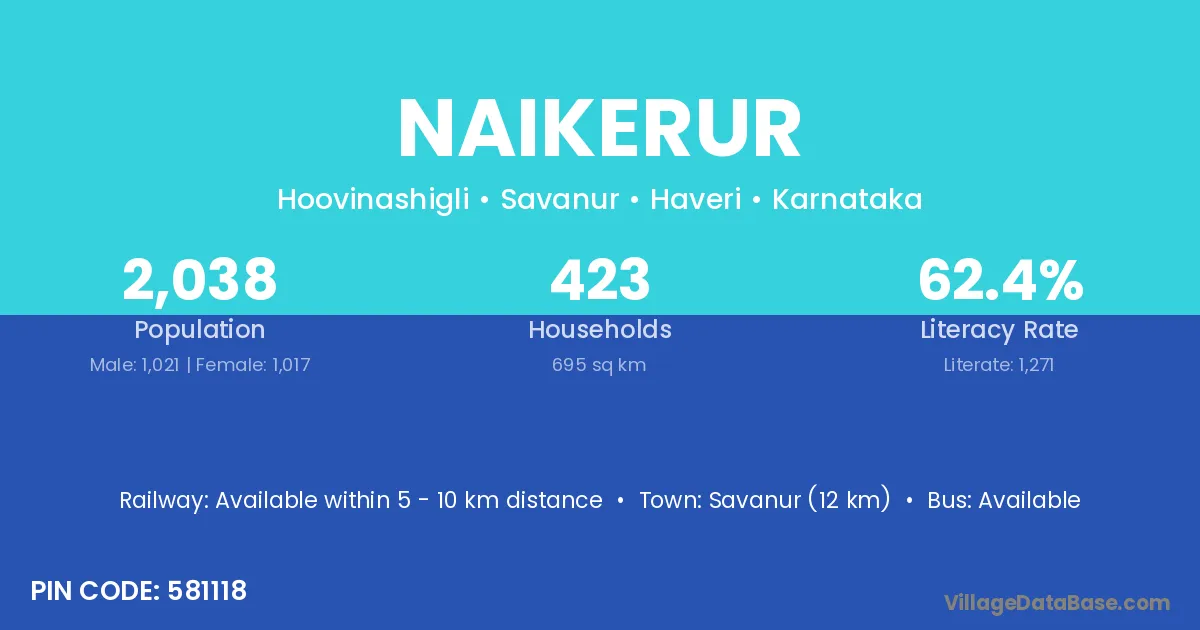 Savanur (12 km) is the nearest town to Naikerur village for major economic activities and is located approximately 12 km away.