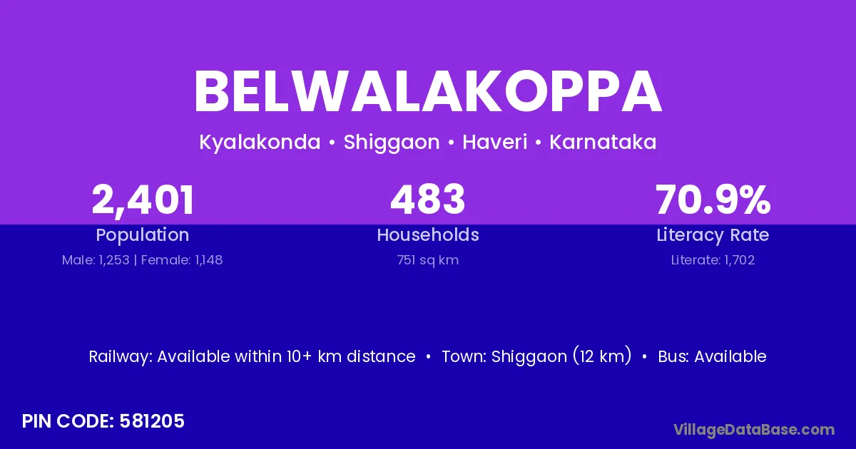 Shiggaon (12 km) is the nearest town to Belwalakoppa village for major economic activities and is located approximately 12 km away.