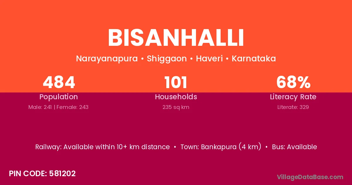 Bankapura (4 km) is the nearest town to Bisanhalli village for major economic activities and is located approximately 4 km away.