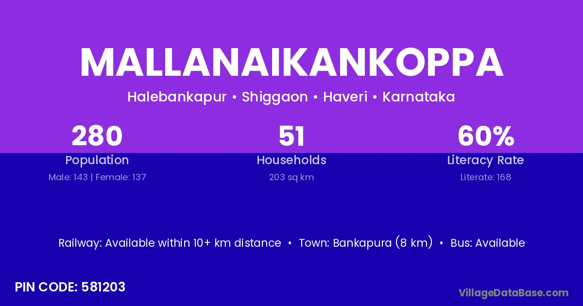 Bankapura (8 km) is the nearest town to Mallanaikankoppa village for major economic activities and is located approximately 8 km away.