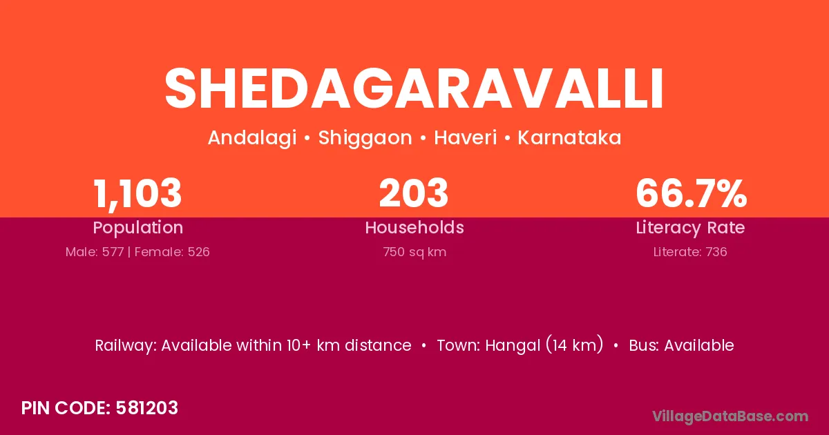 Hangal (14 km) is the nearest town to Shedagaravalli village for major economic activities and is located approximately 14 km away.