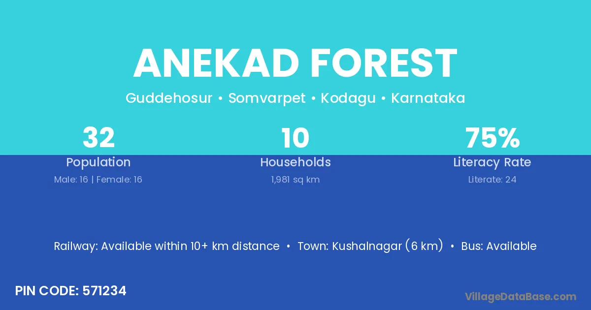 Kushalnagar (6 km) is the nearest town to Anekad Forest village for major economic activities and is located approximately 6 km away.