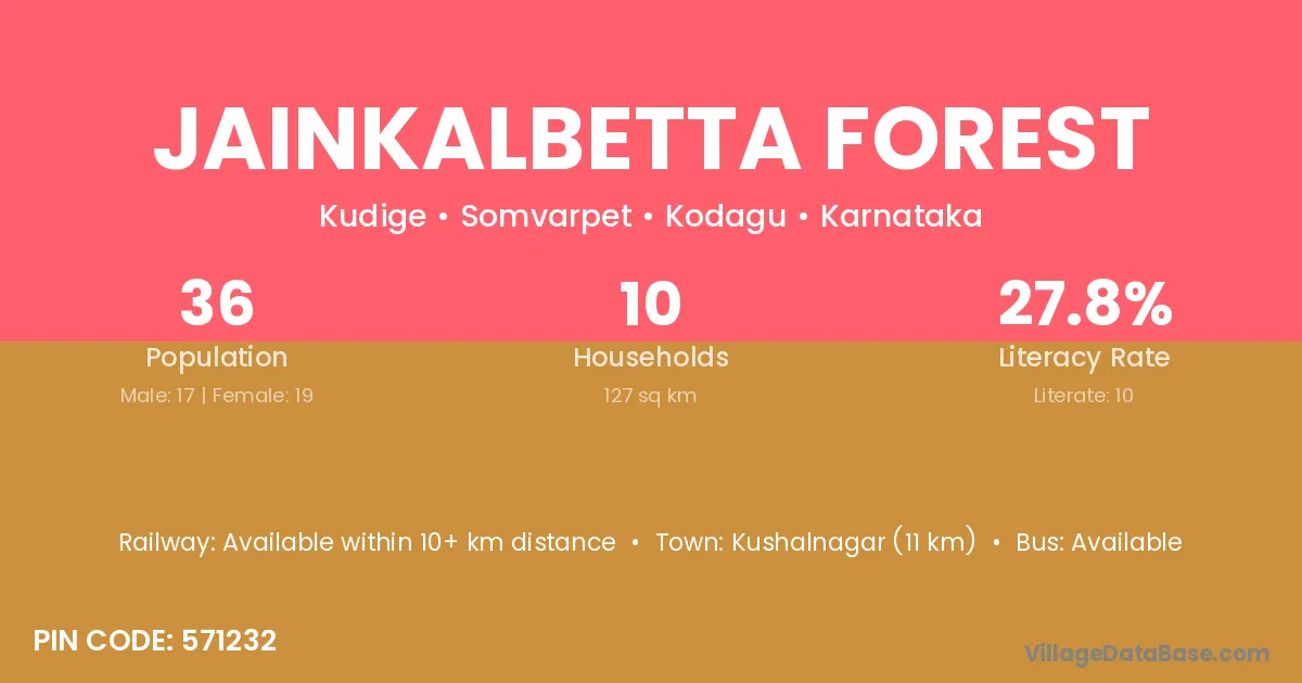 Kushalnagar (11 km) is the nearest town to Jainkalbetta Forest village for major economic activities and is located approximately 11 km away.