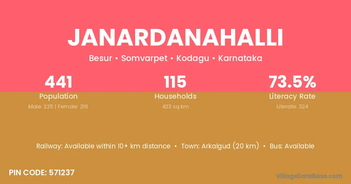Janardanahalli village has a total population of 441 people, of which 225 are males and 216 are females.
