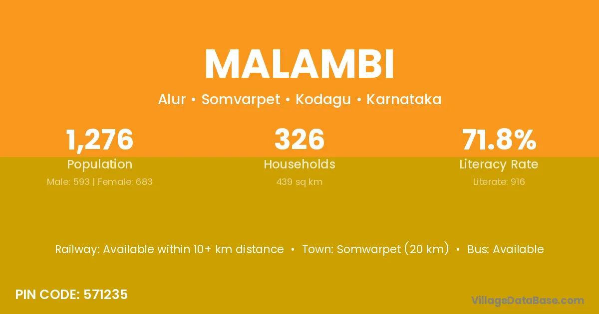 Somwarpet (20 km) is the nearest town to Malambi village for major economic activities and is located approximately 20 km away.