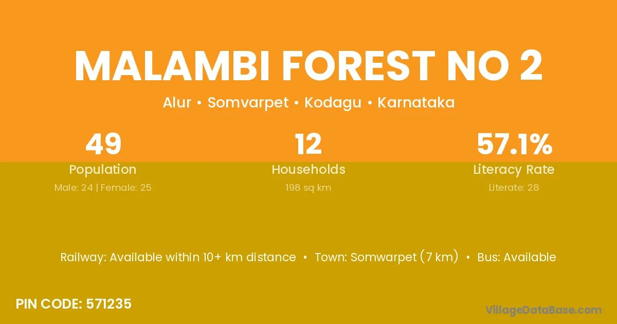 Somwarpet (7 km) is the nearest town to Malambi Forest No 2 village for major economic activities and is located approximately 7 km away.