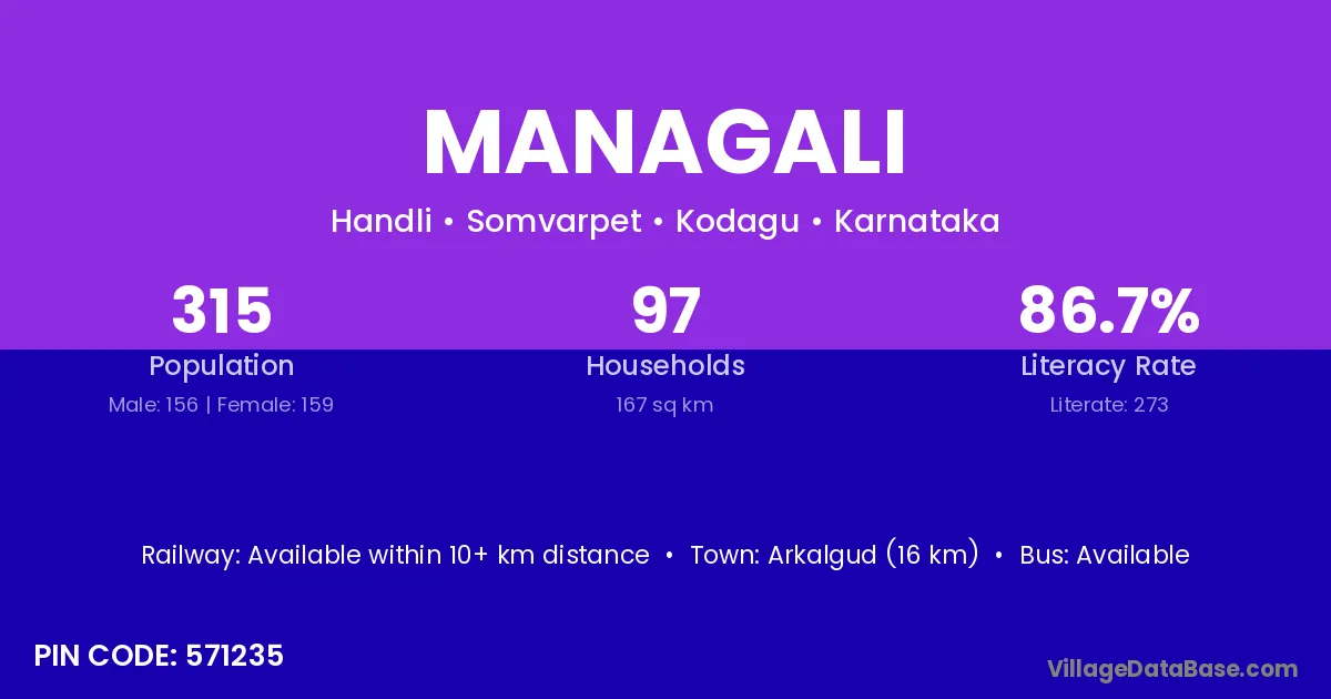 Arkalgud (16 km) is the nearest town to Managali village for major economic activities and is located approximately 16 km away.