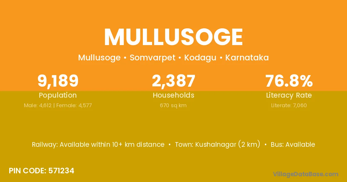 Kushalnagar (2 km) is the nearest town to Mullusoge village for major economic activities and is located approximately 2 km away.
