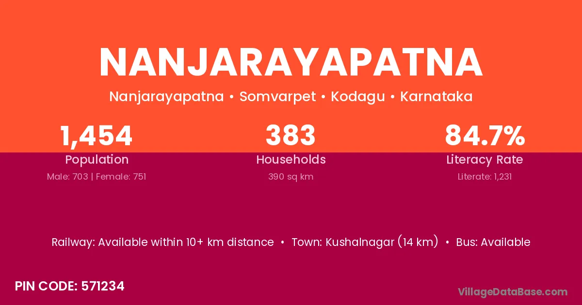 Kushalnagar (14 km) is the nearest town to Nanjarayapatna village for major economic activities and is located approximately 14 km away.