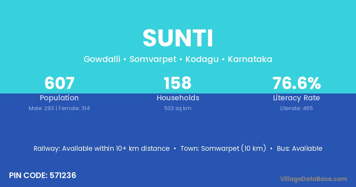 Somwarpet (10 km) is the nearest town to Sunti village for major economic activities and is located approximately 10 km away.