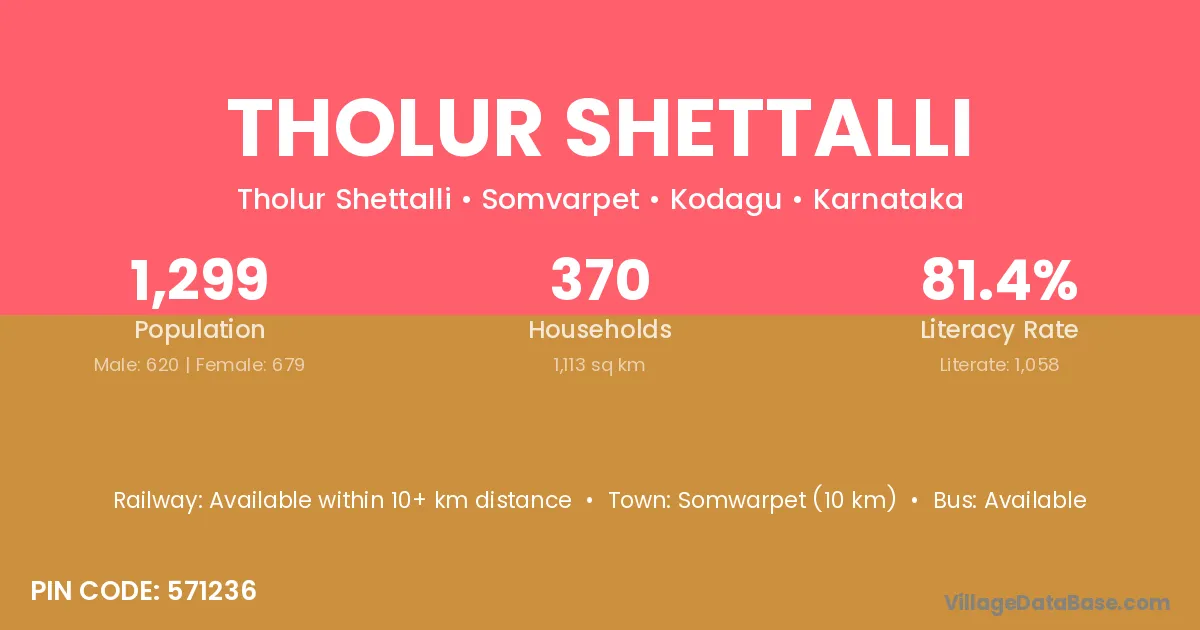 Somwarpet (10 km) is the nearest town to Tholur Shettalli village for major economic activities and is located approximately 10 km away.