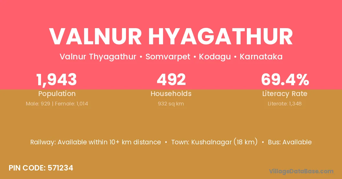 Kushalnagar (18 km) is the nearest town to Valnur Hyagathur village for major economic activities and is located approximately 18 km away.