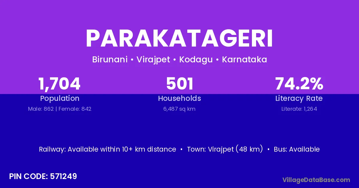 Virajpet (48 km) is the nearest town to Parakatageri village for major economic activities and is located approximately 48 km away.