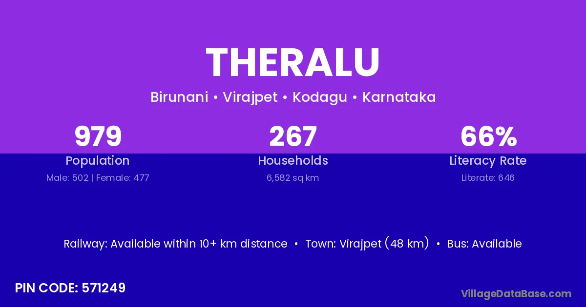 Virajpet (48 km) is the nearest town to Theralu village for major economic activities and is located approximately 48 km away.