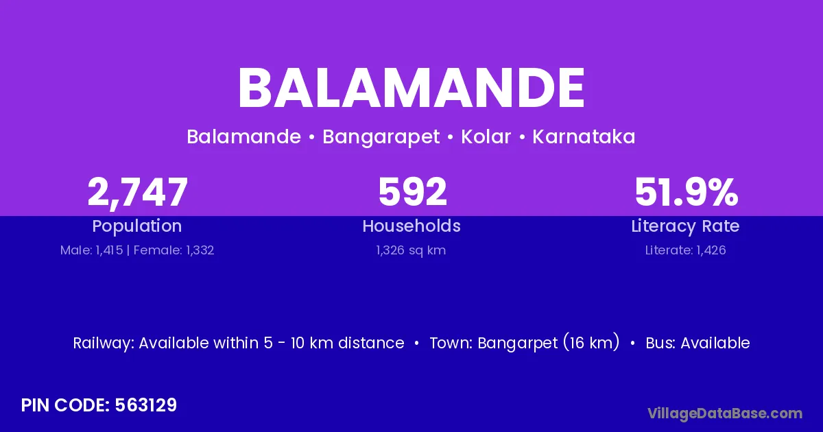 Bangarpet (16 km) is the nearest town to Balamande village for major economic activities and is located approximately 16 km away.