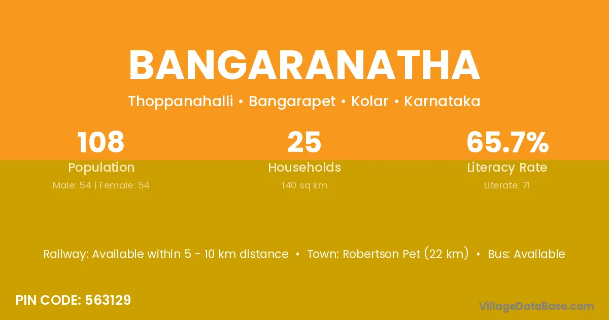 Bangaranatha village has a total population of 108 people, of which 54 are males and 54 are females.