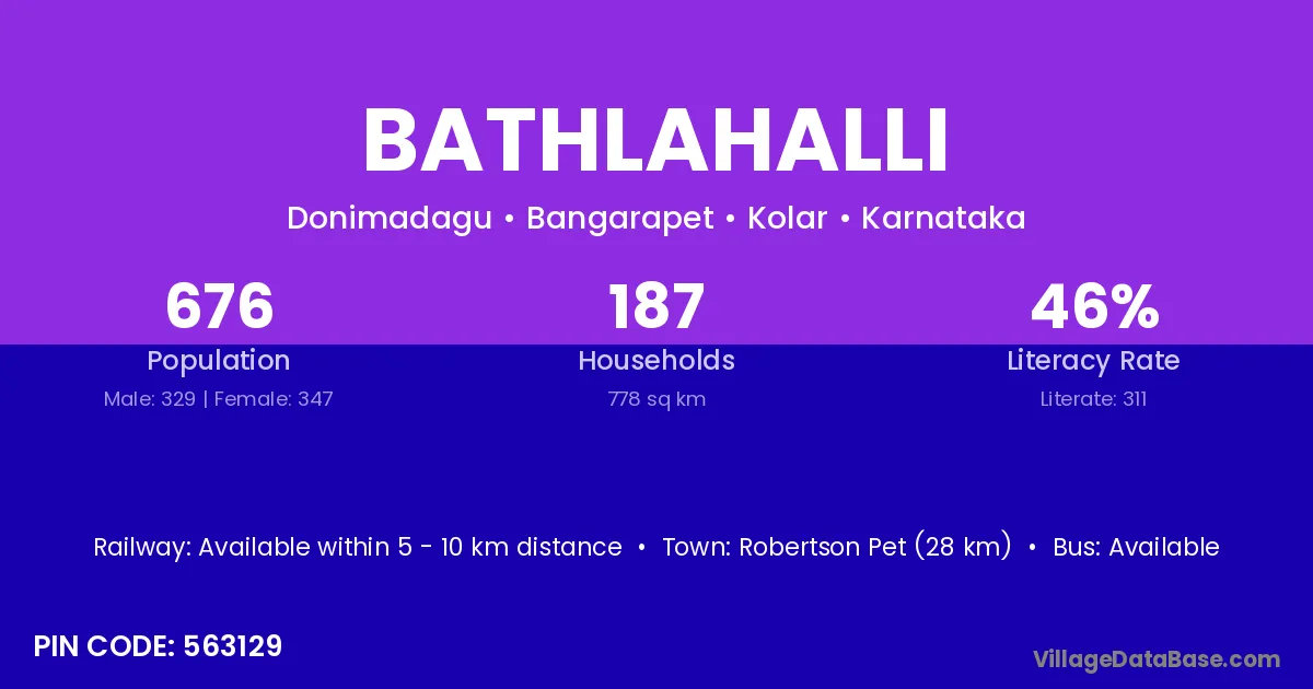 Robertson Pet (28 km) is the nearest town to Bathlahalli village for major economic activities and is located approximately 28 km away.