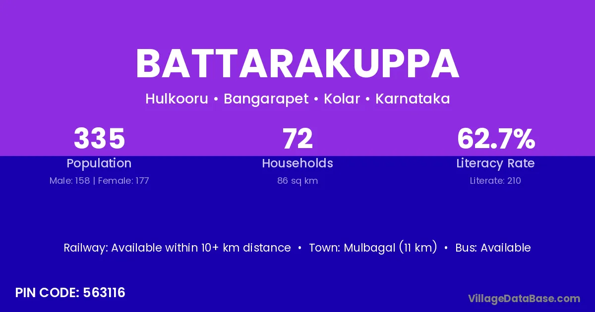 Mulbagal (11 km) is the nearest town to Battarakuppa village for major economic activities and is located approximately 11 km away.