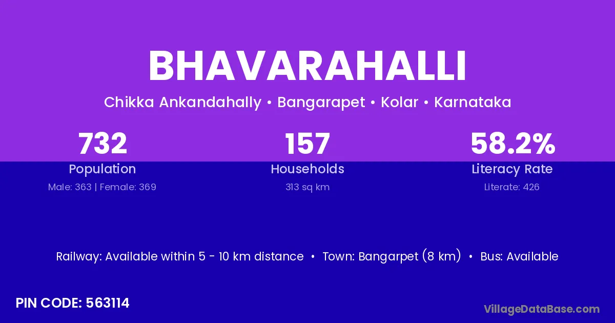 Bangarpet (8 km) is the nearest town to Bhavarahalli village for major economic activities and is located approximately 8 km away.
