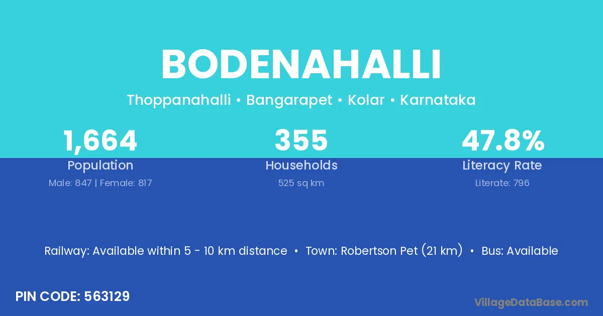 Robertson Pet (21 km) is the nearest town to Bodenahalli village for major economic activities and is located approximately 21 km away.