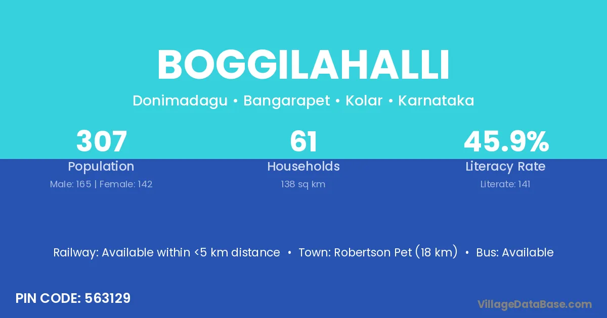Robertson Pet (18 km) is the nearest town to Boggilahalli village for major economic activities and is located approximately 18 km away.