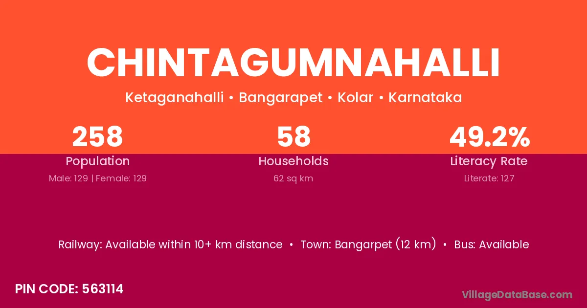 Bangarpet (12 km) is the nearest town to Chintagumnahalli village for major economic activities and is located approximately 12 km away.